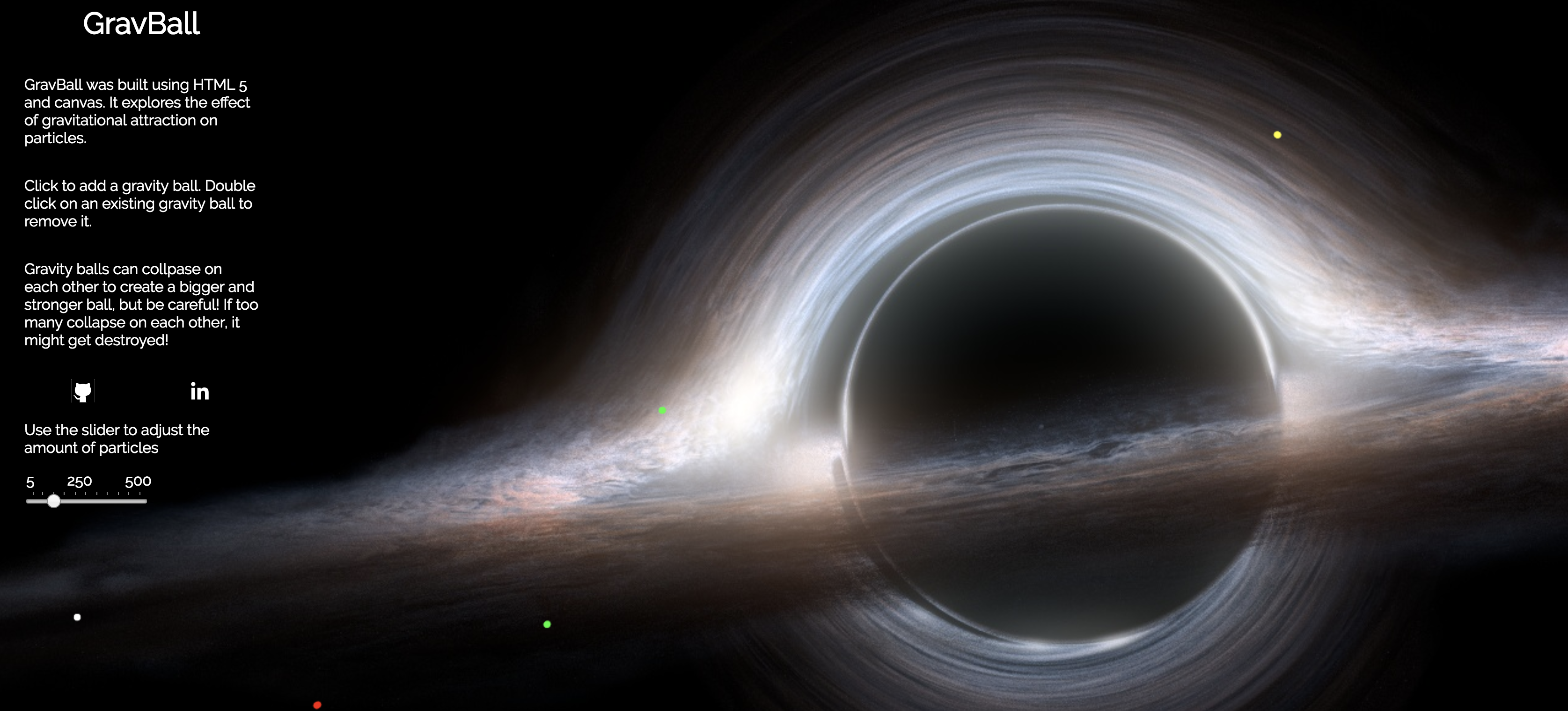 - Immersive graphics and fluid animation of black holes and moving particles.