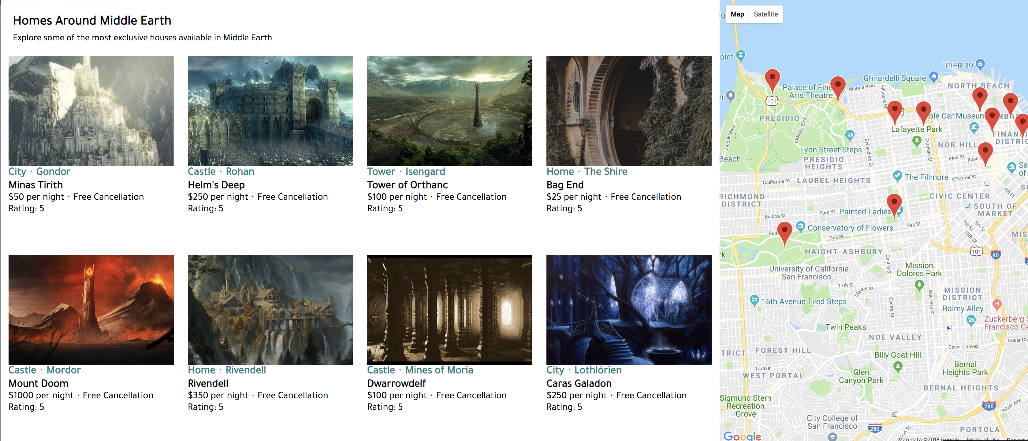 A booking website with Lord of the Rings themed locations based in San Francisco.